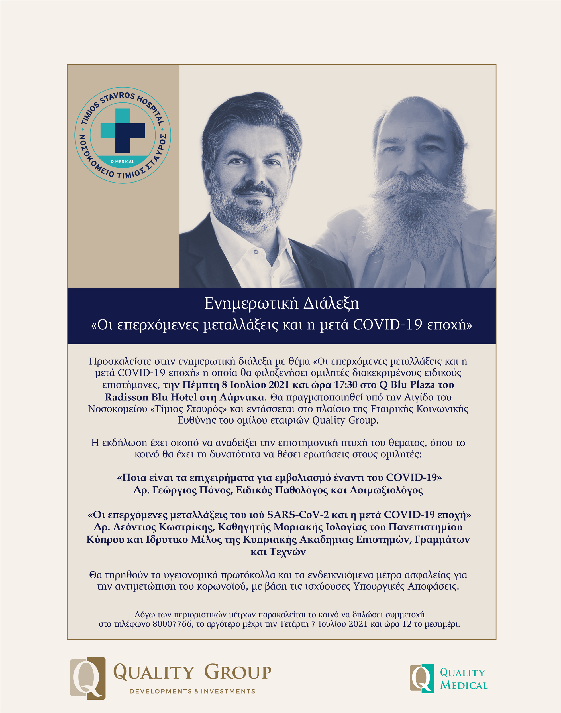 Προσκαλείστε στην ενημερωτική διάλεξη με θέμα «Οι επερχόμενες μεταλλάξεις και η μετά COVID-19 εποχή» η οποία θα φιλοξενήσει ομιλητές διακεκριμένους ειδικούς επιστήμονες, την Πέμπτη 8 Ιουλίου 2021 και ώρα 17:30 στο Q Blu Plaza του Radisson Blu Hotel στη Λάρνακα. Θα πραγματοποιηθεί υπό την Αιγίδα του Νοσοκομείου «Τίμιος Σταυρός» και εντάσσεται στο πλαίσιο της Εταιρικής Κοινωνικής Ευθύνης του ομίλου εταιριών Quality Group.