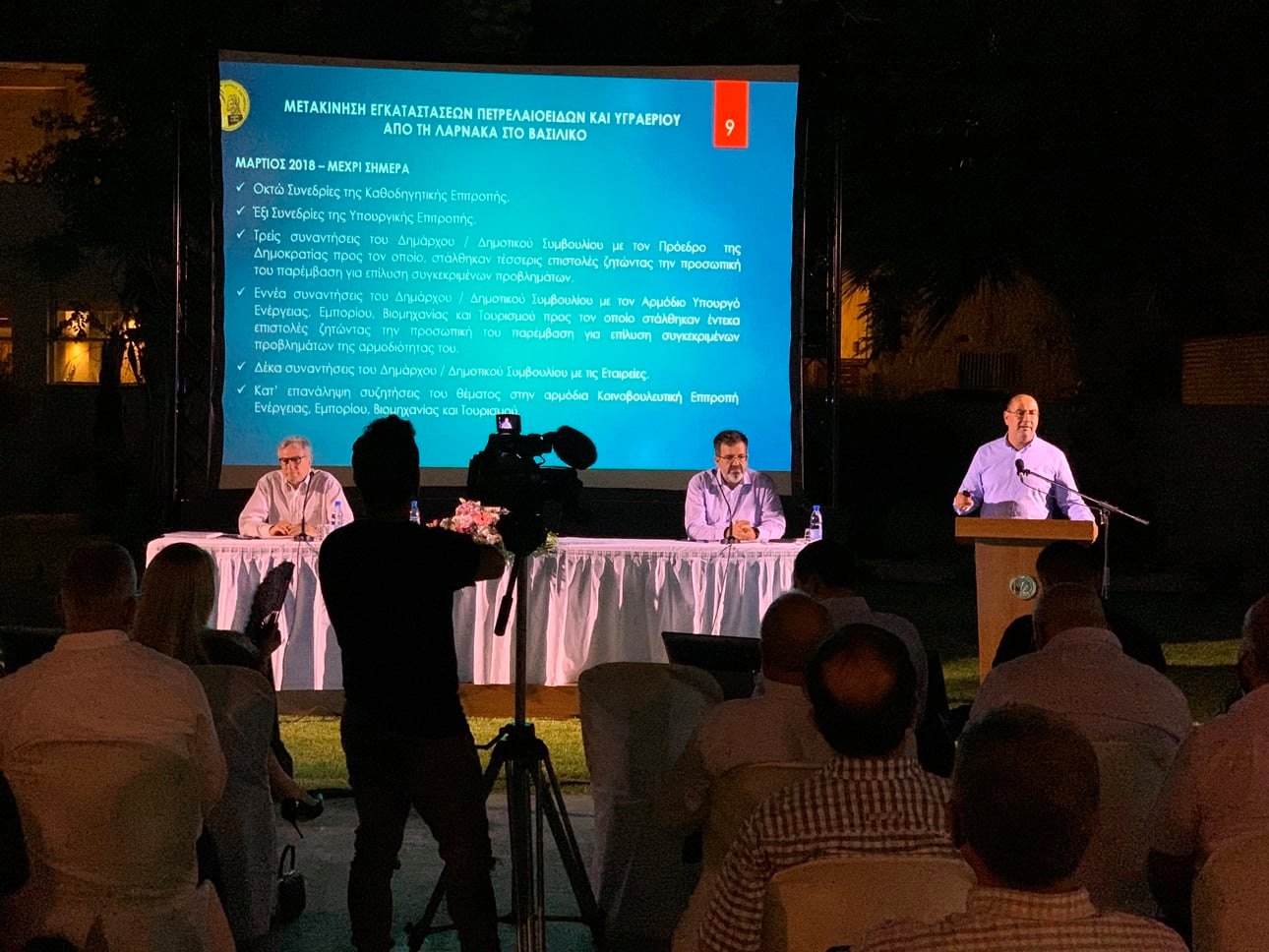 Πραγματοποιήθηκε την Παρασκευή, 9 Ιουλίου 2021, στις 8.00 μ.μ. στο πρόσφατα αναπαλαιωμένο κτίριο του Πολυχώρου Δημιουργικότητας και Πολιτισμού (Πρώην Λέσχη Λάρνακας), η παρουσίαση της διαδικασίας μετακίνησης των εγκαταστάσεων πετρελαιοειδών και υγραερίου από το παραλιακό μέτωπο της Λάρνακας στο Βασιλικό και του Σχεδίου Περιοχής.
