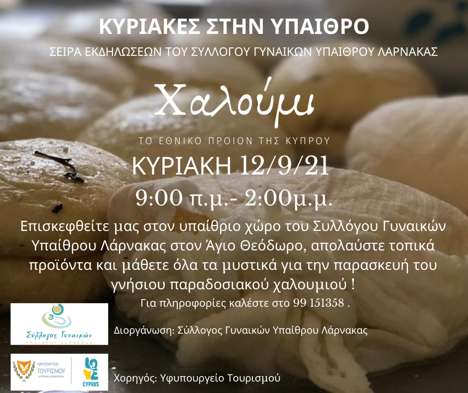 Όπως χαρακτηριστικά αναφέρει η κα. Άννα Κοσμά, Πρόεδρος του Συλλόγου Γυναικών Υπαίθρου Λάρνακας «Την Κυριακή 12 Σεπτεμβρίου 2021 από τις 9.00 π.μ. – 2.00 μ.μ. προγραμματίζεται η δευτερη σε σειρά εκδήλωση, με θέμα «Χαλούμι, το εθνικό προϊόν της Κύπρου» και προσκαλεί όλους σας να επισκεφθείτε τον υπαίθριο χώρο του Συλλόγου Γυναικών Υπαίθρου Λάρνακας στον Άγιο Θεόδωρο, όπου θα έχετε την ευκαιρία να δείτε απο κοντά όλη την διαδικασία της παρασκευής του χαλουμιού, να δοκιμάσετε την αναρή και το χαλούμι που θα παρασκευάσουμε με την βοήθεια χρυσοχέρας της περιοχής μας, να πάρετε πολλές πληροφορίες για τον παραδοσιακό του χαρακτήρα, την πρόσφατη πιστοποίηση του ως Προϊόν Προστατευόμενης Ονομασίας Προέλευσης (ΠΟΠ) αλλά και να γνωρίσετε και πολλά άλλα ολόφρεσκα τοπικά προιόντα και εδέσματα.»