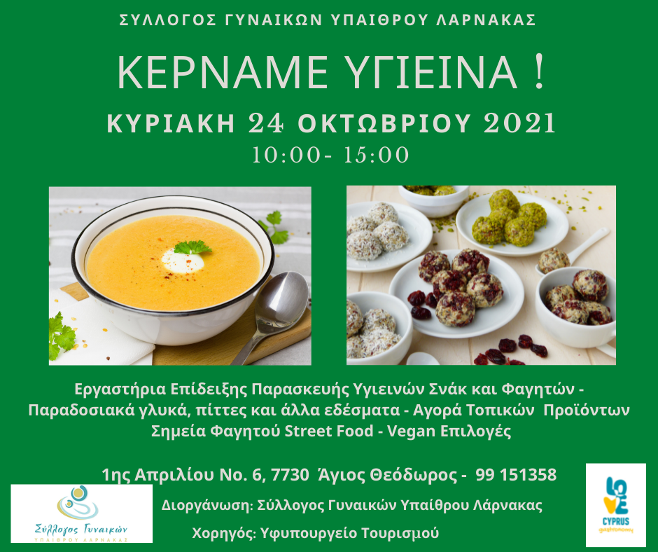 Tην ερχόμενη Κυριακή 24/10/21, ο Σύλλογος Γυναικών Υπαίθρου Λάρνακας θα διοργανώσει ακόμα μία ξεχωριστή εκδήλωση κουλτούρας και γεύσεων με τίτλο «ΚΕΡΝΑΜΕ ΥΓΙΕΙΝΑ!» στα πλαίσια της σειράς εκδηλώσεων με τίτλο «ΚΥΡΙΑΚΕΣ ΣΤΗΝ ΥΠΑΙΘΡΟ» που διοργανώνονται κάθε Κυριακή με σκοπό την προώθηση της κυπριακής οινογαστρονομίας και των τοπικών προϊόντων.