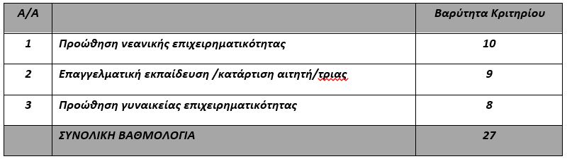 Για την επιλογή των ατόμων που θα συμμετάσχουν στο/α πρόγραμμα/τα κατάρτισης, θα ακολουθηθεί το εξής σύστημα μοριοδότησης που βασίζεται σε κριτήρια που λαμβάνουν υπόψη τα ακόλουθα: