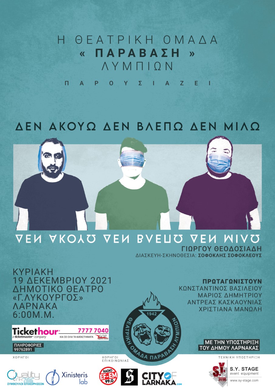 Η Θεατρική ομάδα «Παράβαση» Λυμπιών έρχεται στην πόλη της Λάρνακας για μία και μόνο παράσταση. Η κωμωδία «Δεν ακούω Δεν βλέπω Δεν μιλώ» του Γιώργου Θεοδοσιάδη, σε Διασκευή και Σκηνοθεσία του Σοφοκλή Σοφοκλέους, έχει αποσπάσει τις καλύτερες εντυπώσεις. Μια παράσταση γεμάτη γέλιο, χιούμορ, συγκίνηση αλλά και με πολλά μηνύματα που δεν πρέπει να τη χάσει κανένας.