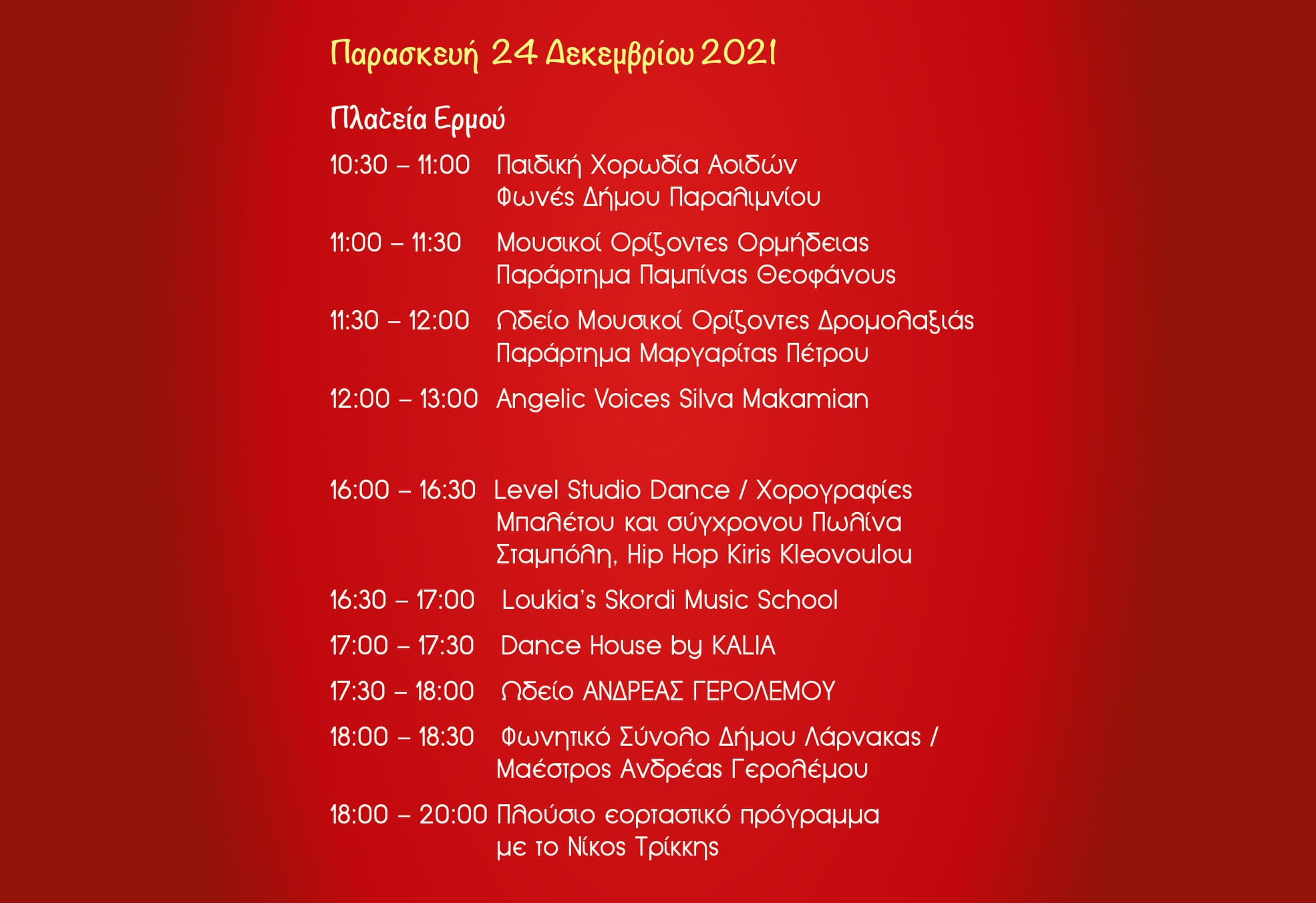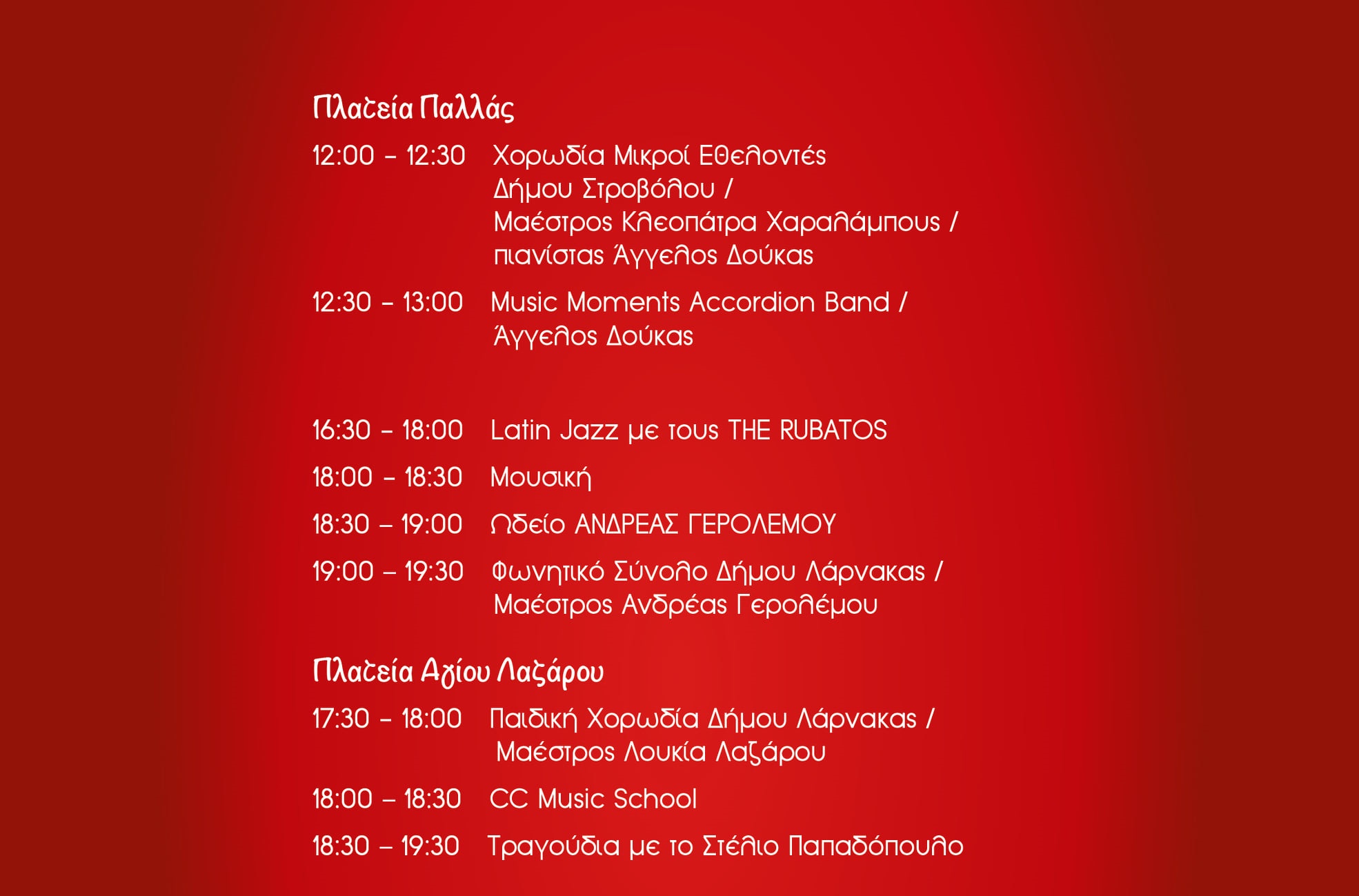 Από τις 16:00 μέχρι τις 22:00 όμορφες μελωδίες θα κατακλύσουν και σήμερα τις πλατείες Παλλάς, Ερμού και Αγίου Λαζάρου. Χορωδίες,  μουσικές μπάντες χοροί κ.α σας περιμένουν στο κέντρο της πόλης μας σήμερα Παραμονή Χριστουγέννων.