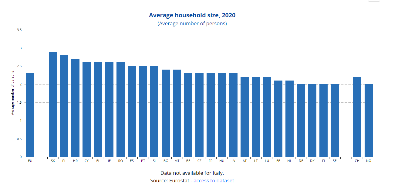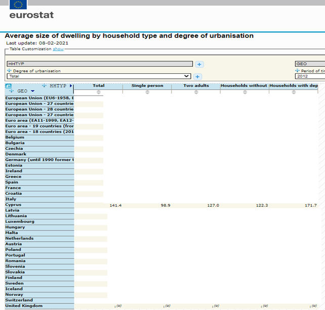 2. Με βάση την έκδοση Housing in Europe της Eurostat (Γράφημα 2) η Κύπρος έχει την 4η ψηλότερη θέση και πολύ ψηλότερο μέγεθος από τον μέσο όρο σε ότι αφορά το μέγεθος του μέσου νοικοκυριού, δηλαδή του αριθμού των ατόμων που διαμένουν σε μια κατοικία. Αυτό συνάδει και από την γενικότερη αντίληψη πως λόγω ηθών, κουλτούρας και κοινωνικών – οικονομικών λόγων τα παιδιά αποχωρούν από το πατρικό τους σε μεγαλύτερες ηλικίες. Νοείται πως μεγαλύτερες ηλικίες σημαίνει κατά κανόνα αυξημένες ανάγκες στο μέγεθος μιας κατοικίας. Επιπλέον γενικότερα η δομή της κυπριακής κοινωνίας στηρίζεται πάνω σε ισχυρούς κοινωνικούς δεσμούς, κάτι που μεταφράζεται στη χρήση της κατοικίας ως χώρου κοινωνικής συνεύρεσης και όχι αποκλειστικά ως χώρο διημέρευσης.