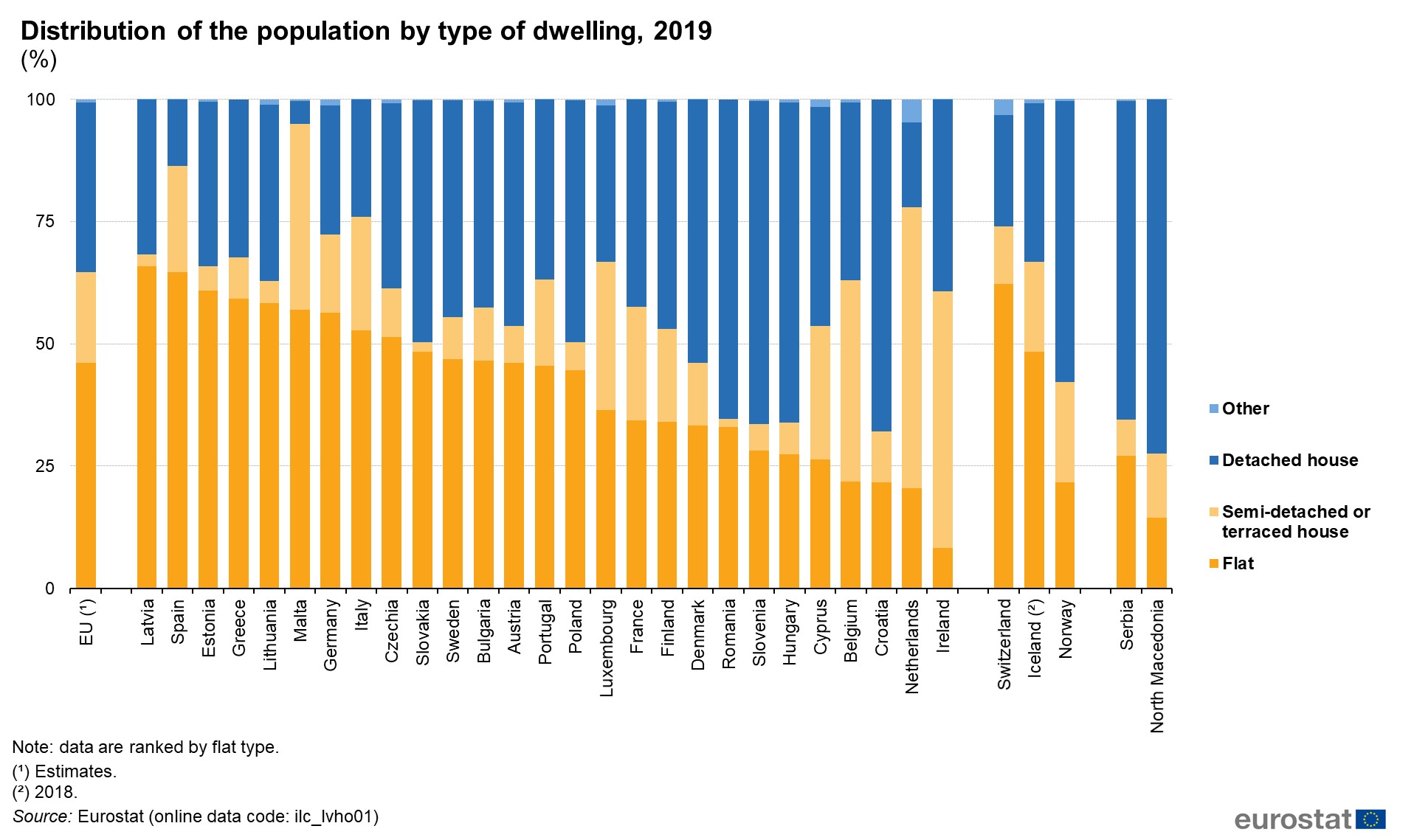 1. Με βάση την έκδοση Housing in Europe της Eurostat (2019) (Γράφημα 1) στην πλειοψηφία τους (περί του 75%) τα νοικοκυριά εξακολουθούν να προτιμούν τη διαμονή σε κατοικία (ημιεφαπτόμενη και ανεξάρτητη) παρά σε διαμέρισμα κάτι που συνάδει και από γενική αντίληψη που υπάρχει περί του θέματος αυτού. Σημειώνεται πως σε αντιπαραβολή με τα δεδομένα της Eurostat για το 2012, το 2019 παρατηρείτε μια μικρή αύξηση στο ποσοστό διαμερισμάτων επί του συνόλου.