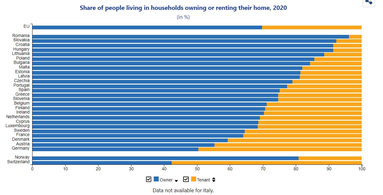 3. Με βάση πάλι την έκδοση Housing in Europe της Eurostat (2020) (Γράφημα 3), παρά τη γενικότερη αντίληψη που υπάρχει επί του προκειμένου, το ποσοστό των νοικοκυριών που έχουν ιδιόκτητη στέγη είναι 70%. Το ποσοστό αυτό (70%) φτάνει μόλις στο μέσο όρο της ΕΕ και υπολείπεται της πλειοψηφίας αριθμού ευρωπαϊκών χωρών. Σημειώνεται πως με βάση τα στοιχεία της Eurostat για το 2012 το ποσοστό ιδιοκατοίκησης ήταν στο 75% και ελαφρώς υψηλότερο από το μέσο όρο της ΕΕ.