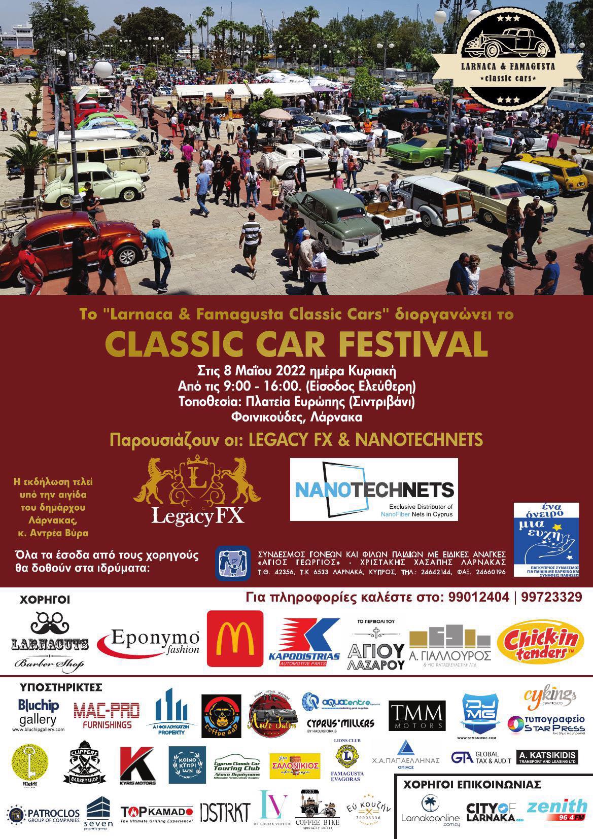 After our huge success in May 2019 with over 210 classic cars and 2 years of absence due to covid we are ready for our third festival ! Meeting Sunday 8th of May finikoudes Larnaca (fountain) where we will park our classics from 09:00-16:00 giving the opportunity to passersby and classic car enthusiasts to enjoy the scenery . This time too the event will be for charity! All money raised from sponsors , purchases of meals and drinks that will be at the event will be donated to the Chistakis hassapis (people with special needs) home in larnaca and at Ένα όνειρο μια ευχή (kids with cancer)