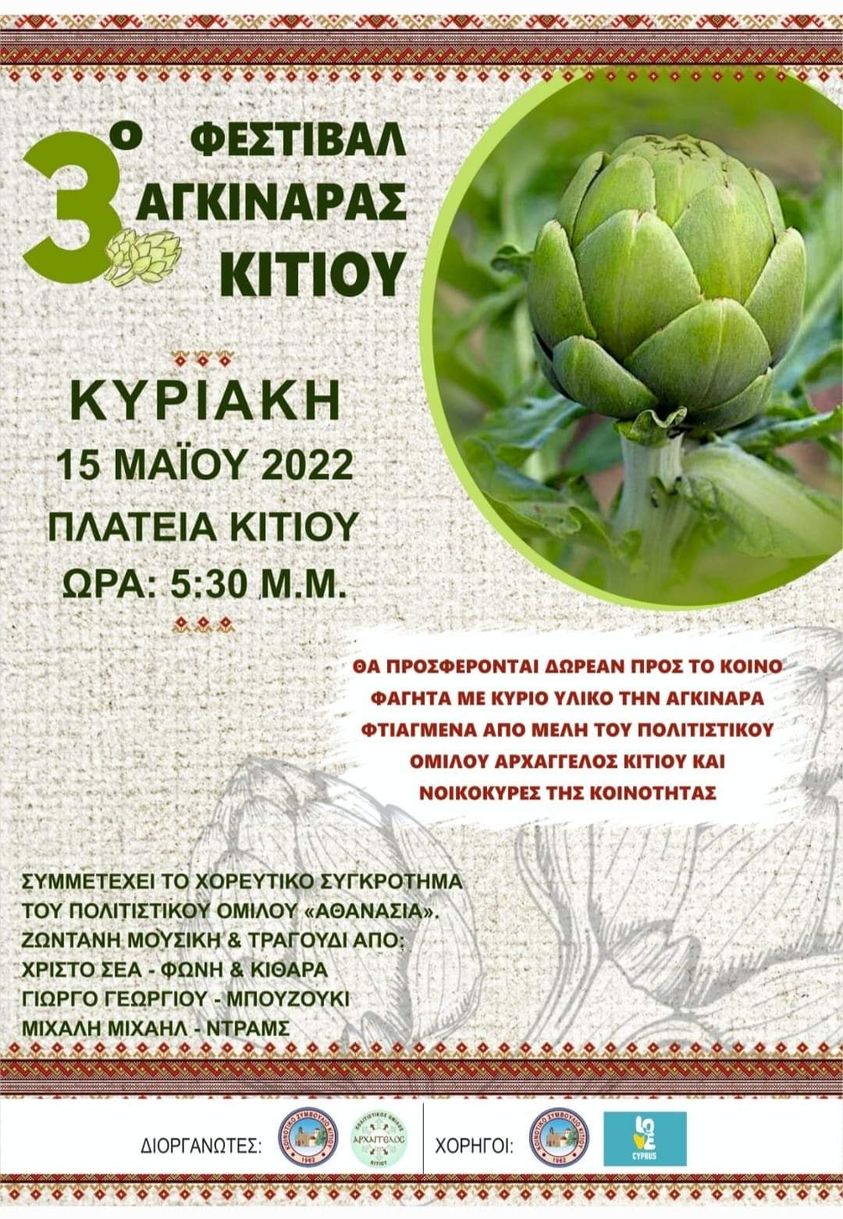 Το 3ο Φεστιβάλ Αγκινάρας Κιτίου, πραγματοποιείται την Κυριακή 15 Μαϊου 2019 και ώρα 5.30 μ.μ. στην πλατεία Κιτίου.