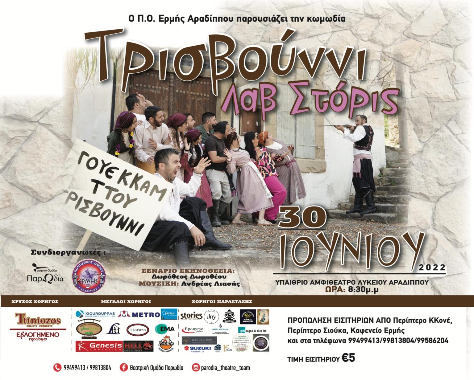 Σε συνεργασία με τον Πολιτιστικός Όμιλος Ερμής Αραδίππου οι Τρισβουνιώτες τζαι οι Τρισβουνιώτισσες μας παρουσιάζουν ξανά τις πιο τρελές ιστορίες αγάπης.
