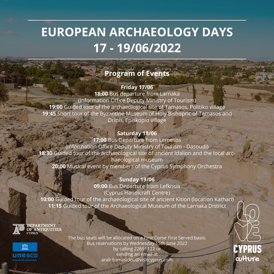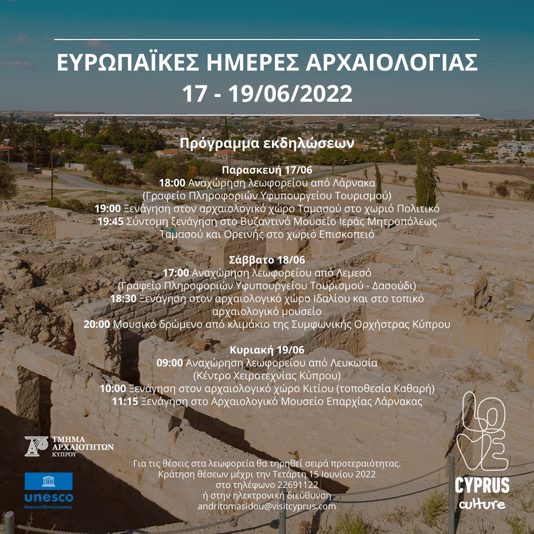 Το Υφυπουργείο Τουρισμού και το Τμήμα Αρχαιοτήτων, σε συνεργασία με την Εθνική Επιτροπή ΟΥΝΕΣΚΟ διοργανώνουν εκδηλώσεις στη Λάρνακα, στο πλαίσιο των Ευρωπαϊκών Ημερών Αρχαιολογίας 17-19/06/2022.