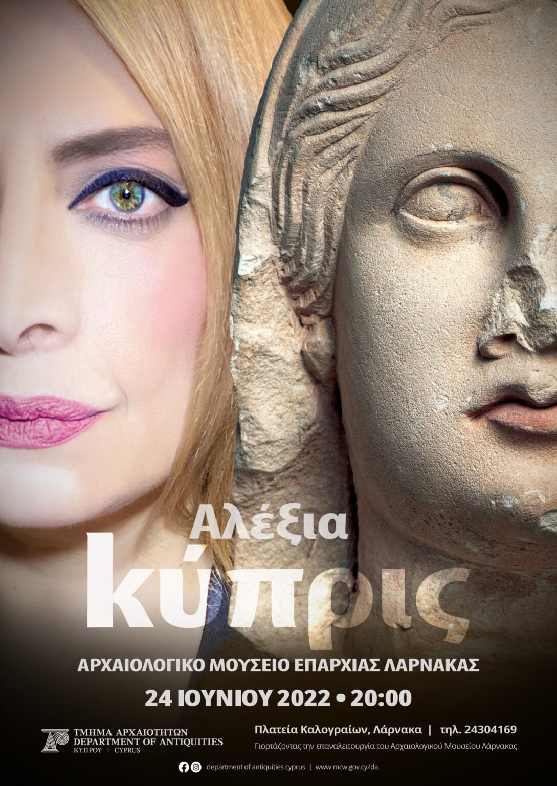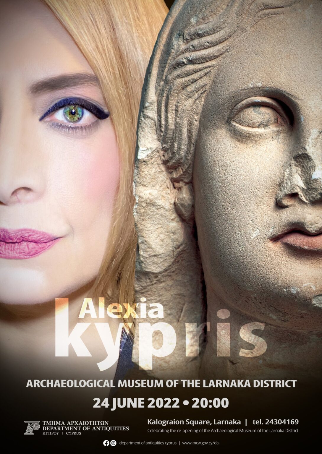Το Τμήμα Αρχαιοτήτων, Υπουργείο Μεταφορών, Επικοινωνιών και Έργων ανακοινώνει ότι στις 24 Ιουνίου 2022 στις 20:00 θα πραγματοποιηθεί στο Αρχαιολογικό Μουσείο Επαρχίας Λάρνακας συναυλία υπό τον τίτλο «Κύπρις» με την διεθνώς αναγνωρισμένη και πολυβραβευμένη καλλιτέχνιδα Αλέξια Βασιλείου.