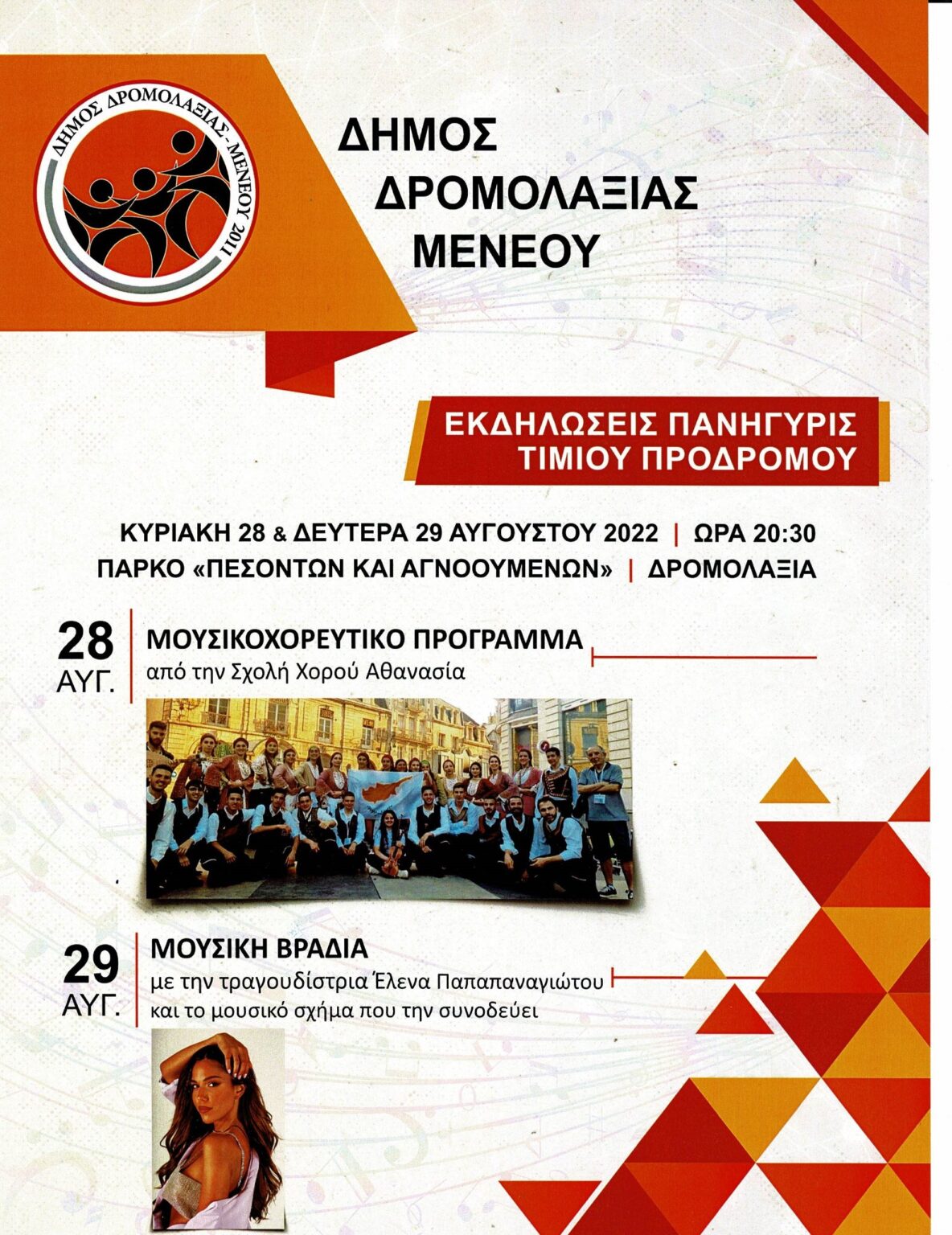 Ο Δήμος Δρομολαξιάς – Μενεού, διοργανώνει ένα διήμερο εορταστικών εκδηλώσεων με την ευκαιρία της πανήγυρις για την εορτή του Τιμίου Προδρόμου, το Σάββατο 28 Αυγούστου και την Κυριακή 28 Αυγούστου 2022, στις 8.30 μ.μ. στο Πάρκο Πεσόντων και Αγνοούμενων στη Δρομολαξιά.