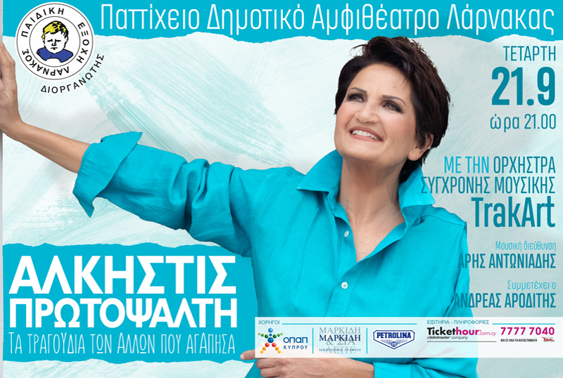 Την Τετάρτη 21 Σεπτεμβρίου στις 9:00 μ.μ. στο ΠΑΤΤΙΧΕΙΟ ΔΗΜΟΤΙΚΟ ΑΜΦΙΘΕΑΤΡΟ η Άλκηστις Πρωτοψάλτη παρουσιάζει «Τα τραγούδια των άλλων που αγάπησα» με την Ορχήστρα Σύγχρονης Μουσικής TrakArt.