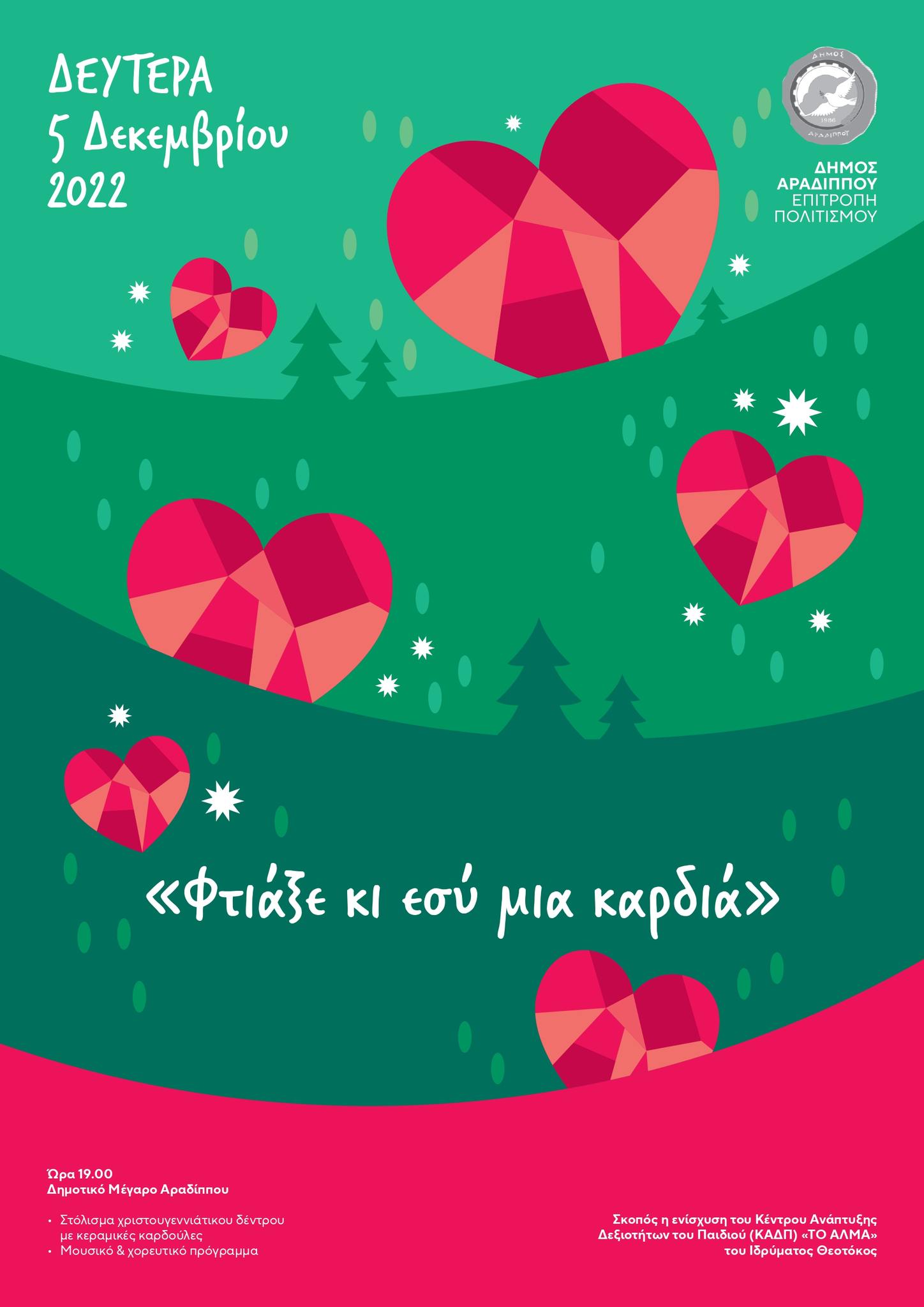 Στο πλαίσιο αυτό, τη Δευτέρα, 5 Δεκεμβρίου και ώρα 19.00, θα πραγματοποιηθεί στο Δημοτικό Μέγαρο Αραδίππου, διακόσμηση χριστουγεννιάτικου δέντρου με κεραμικές καρδούλες και θα ακολουθήσει μουσικό και χορευτικό πρόγραμμα.