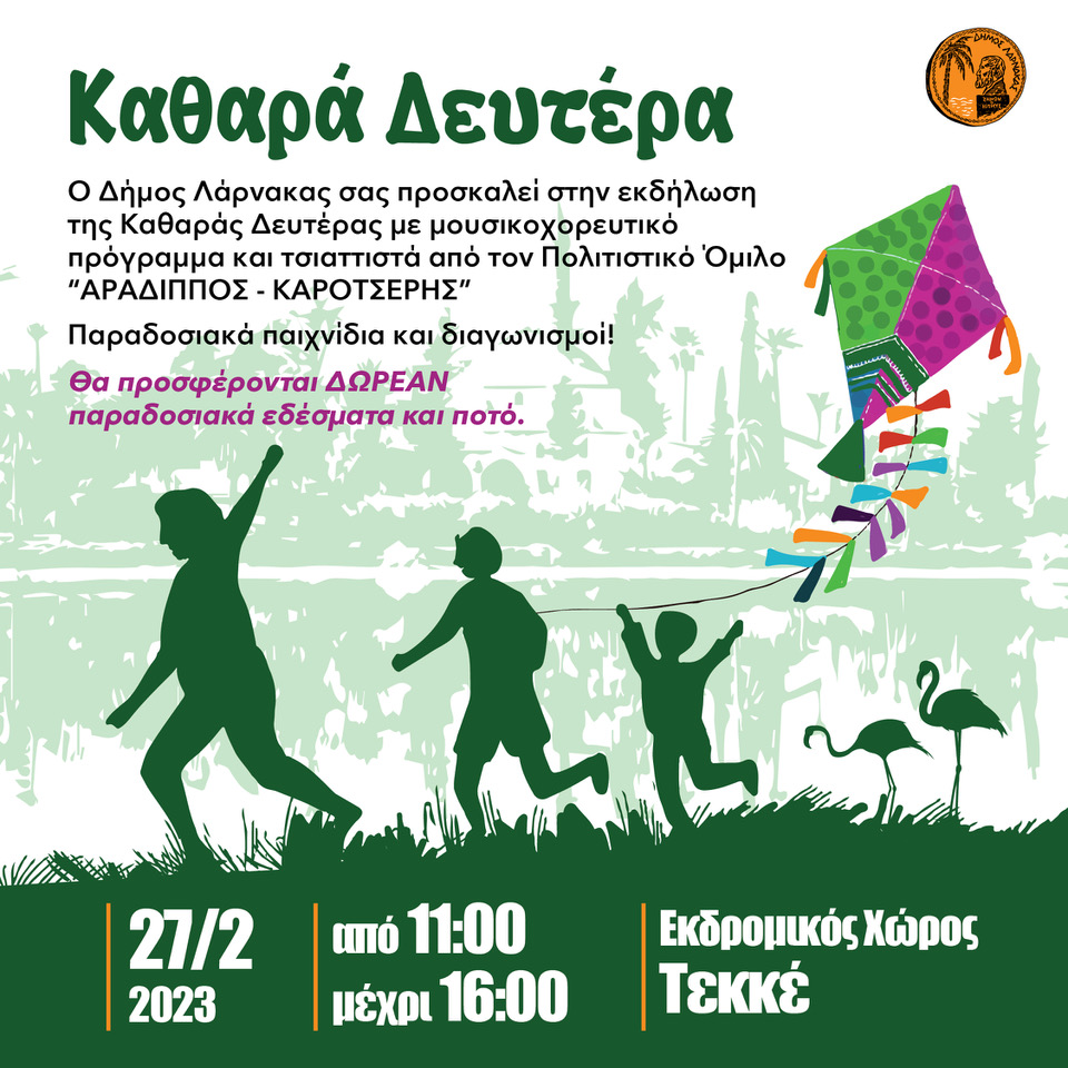 Μετά την Παρέλαση, σειρά παίρνει ο εορτασμός της Καθαράς Δευτέρας, στις 27 Φεβρουαρίου 2023,  που όπως κάθε χρόνο πραγματοποιείται στον εκδρομικό χώρο Τεκκέ. Ο Δήμος Λάρνακας θα προσφέρει παραδοσιακά εδέσματα ενώ η ημέρα θα πλαισιωθεί με παραδοσιακή μουσική, τραγούδια, τσιαττιστά, χορούς, παιγνίδια και δραστηριότητες για παιδιά.