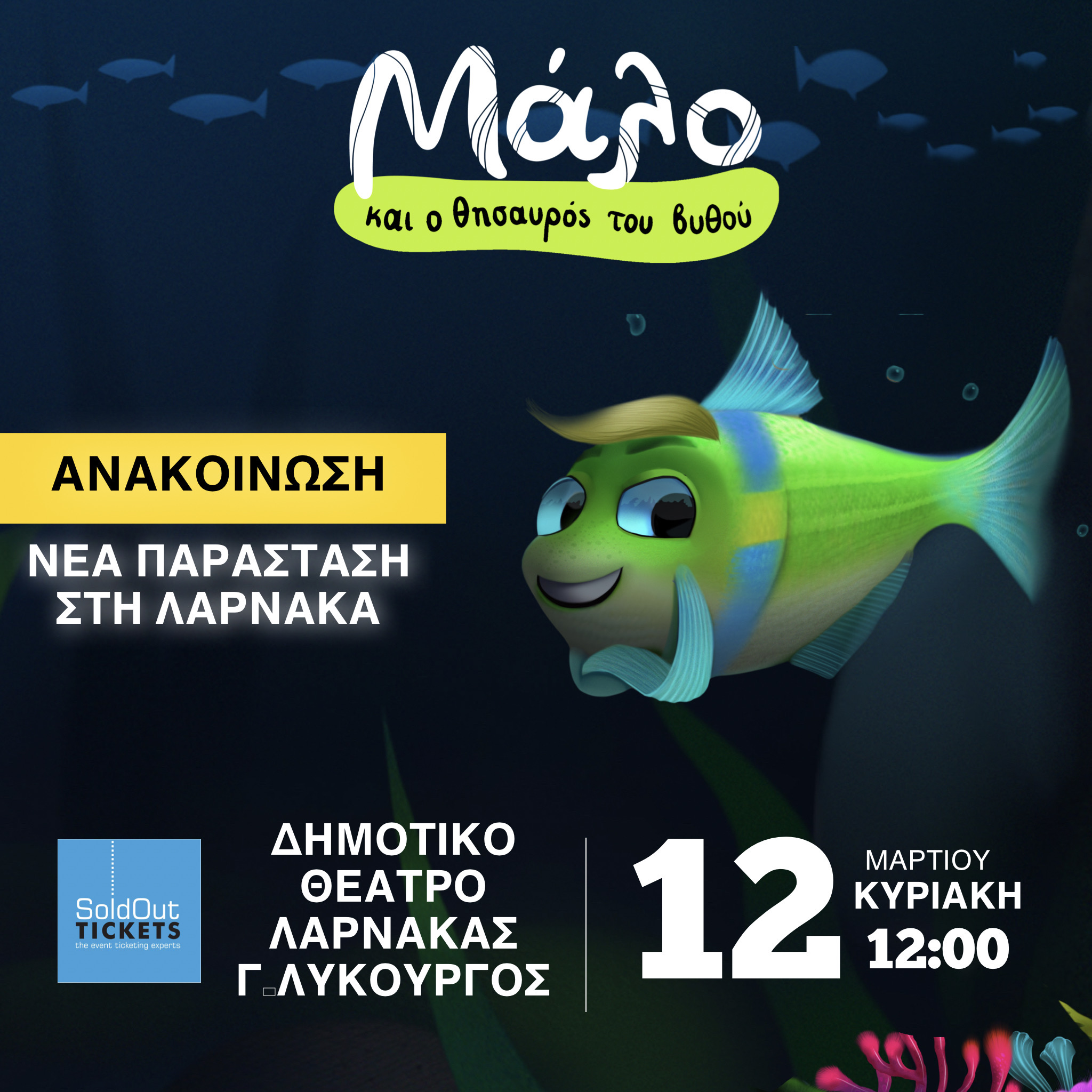 Την Κυριακή 12 Μαρτίου 2023 στις 12.00 το μεσήμερι στο Δημοτικό Θέατρο της Λάρνακας Γιώργος Λυκούργος, έρχεται για τους μικρούς μας φίλους η Παιδική παράσταση «Μάλο και ο θησαυρός του βυθού».