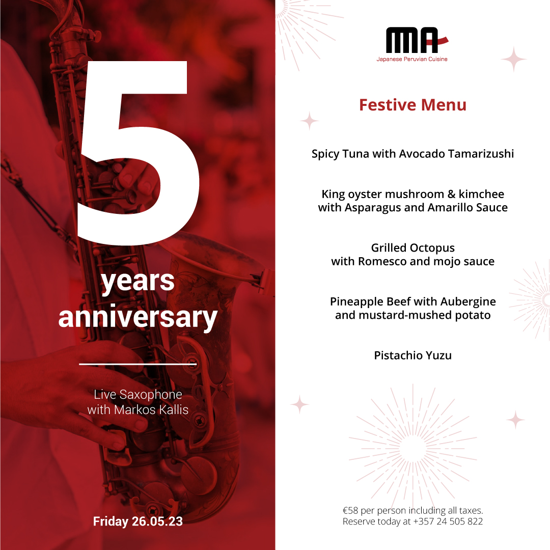 Ειδικά για την περίσταση ο executive chef Απόλλωνας Καδής έχει επιμεληθεί ένα εορταστικό μενού πέντε πιάτων που αναδεικνύουν τη Nikkei κουζίνα, εστιάζοντας στην αρμονία μεταξύ των περουβιανών υλικών και των ιαπωνικών τεχνικών, συνθέτοντας κορυφαίες γευστικές προτάσεις για να ευχαριστήσει τους λάτρεις του Ma Restaurant που αυτά τα πέντε χρόνια το έχουν κατατάξει στα καλύτερα εστιατόρια διεθνούς κουζίνας!