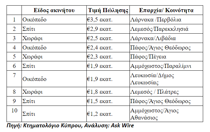 Η Ask WiRE, εταιρεία η οποία συνδυάζει την τεχνογνωσία στον τομέα των ακινήτων με την αξιοποίηση της τεχνολογίας, επεξεργάστηκε και δημοσιεύει τη συνολική αξία των 10 ακριβότερων πράξεων πώλησης ακινήτων, που ολοκληρώθηκαν τον Ιούλιο του 2023 και τη συνολική αξία των 10 ακριβότερων πωλήσεων ανά επαρχία.