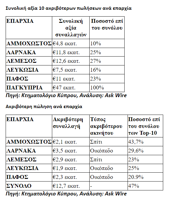 Πράξεις αξίας πέραν των 35 εκατ. ευρώ καταγράφηκαν στις επαρχίες Λεμεσού, Πάφου και Λάρνακας. Συγκεκριμένα η δεκάδα των ακριβότερων ακινήτων της Λεμεσού πωλήθηκε έναντι €12,6, η δεκάδα ακινήτων της Λάρνακας έναντι €11,8 εκατ. και της Πάφου έναντι €11 εκατ.. Μικρότερης αξίας (€7,5 εκατ.) ήταν τα δέκα πιο ακριβά ακίνητα που πωλήθηκαν στην επαρχία Λευκωσίας, την οποία ακολούθησε η Αμμόχωστος (€4,8 εκατ.).