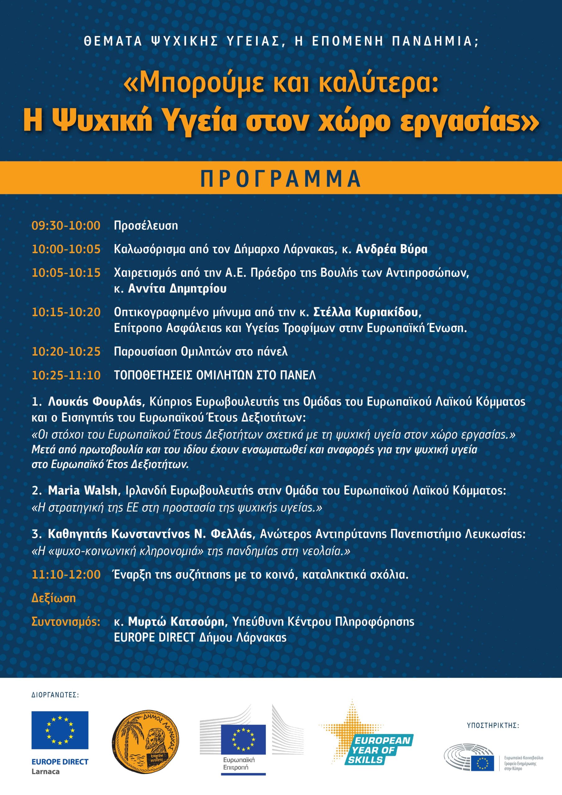 Για περισσότερες πληροφορίες και δηλώσεις συμμετοχής, στο email europedirectlarnaca@cytanet.com.cy μέχρι τις 15 Σεπτεμβρίου.